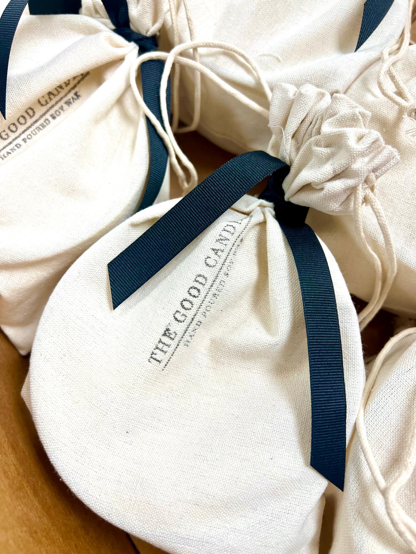 Packaged in a reusable cotton drawstring bag. 20oz of soy wax in a reusable glass vessel. 3 wicks approximate burn time 90+ hrs. Ribbon color may vary depending on availability